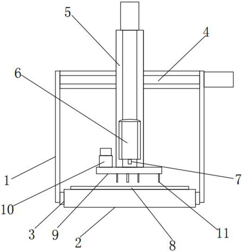 本实用新型公开了一种自动化线路板生产用打孔装置,包括龙门架、加工台、X轴电动滑轨、Z轴电动滑轨、Y轴电动滑轨、钻孔电机以及可调式钻杆切换装置;X轴电动滑轨安装在加工台的左右侧面上;龙门架横置在加工台的上方位置,龙门架的左右侧梁的底部位置分别安装在X轴电动滑轨上;Z轴电动滑轨安装在龙门架的横梁上,本案采用可切换式结构,低成本的情况下实现钻头的快速切换,在原有的三轴驱动结构下,整体可以实现单机加工,可有效的实现老设备的升级改造,且相对成本低。