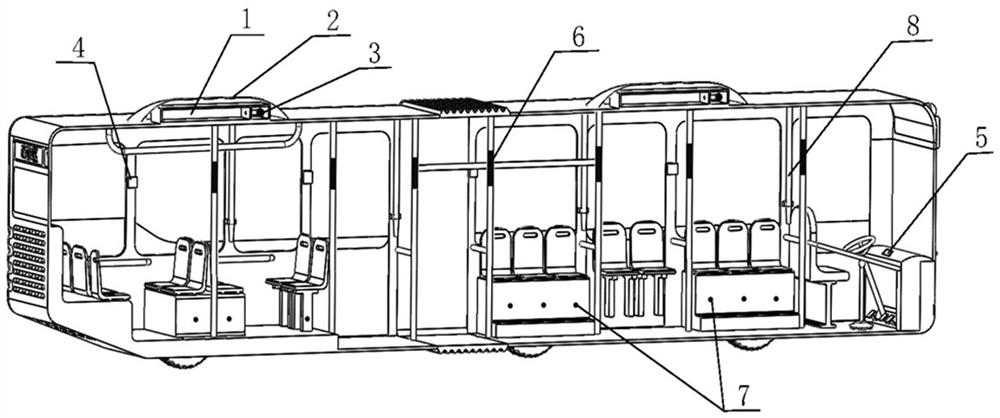本发明公开了一种联动式公交车灭火系统,包括储罐、冷却层、电磁阀、紧急按钮、控制面板、声光警报灯、触发组件及喷淋组件,所述储罐用于储存灭火剂,所述储罐放置于车顶前后部,在储罐外侧设置有冷却层,所述电磁阀位于储罐出口,用于控制储罐和管路的联通,所述管路位于公交车内部,用于连接储罐和喷淋组件。本发明解决了目前传统公交车灭火系统因消防泵功率大无法驱动需增加额外电源、喷淋系统“一点起火,全车灭火”,造成灭火剂的浪费等问题。