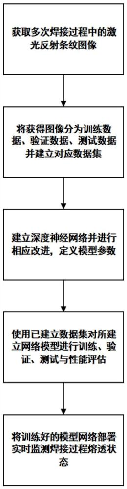 本发明属于焊接技术图像处理技术领域,公开了一种脉冲钨极氩弧焊熔透状态检测方系统、终端、介质,获取多次焊接过程中的激光反射条纹图像,将获得的图像分为训练数据、验证数据、测试数据;构建深度神经网络并进行优化,同时定义模型参数;并利用训练数据、验证数据、测试数据分别对构建的深度神经网络模型进行训练、验证、测试与评估,将训练好的模型网络进行焊接熔透检测。本发明对激光视觉法得到与熔深相关条纹图像进行基于改进LeNet5深度神经网络框架识别学习训练后的检测分类,对测试图像熔深识别准确率可达98.6%,可实现焊接状态实时调控,减少人工参与度,提高焊接质量。