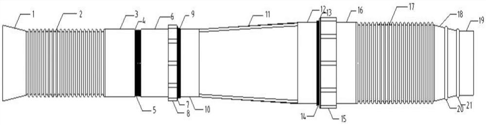 本实用新型公开了一种改进的新型装配式道路PC井身与管道接口装置,包括可变性系统、连接系统、防水系统、井身与管道的固定系统。可变性系统包括入口波纹管道、出口波纹管道;连接系统包括螺母管道、螺纹管道;防水系统包括连接系统橡胶防水圈、入口固定螺母橡胶防水圈、出口固定螺母橡胶防水圈、入口管道连接橡胶防水圈、出口管道连接橡胶防水圈,固定系统包括入口固定螺母、出口固定螺母、变截面二分之一圆管道;本实用新型属于道路工程领域,提供的装置使用组装方便,质量可以有效的控制,可以很好的解决PC井与管道的连接问题,新型装配式道路PC井与管道接口装置对于现场施工的质量控制及减少施工时间具有重要的意义。