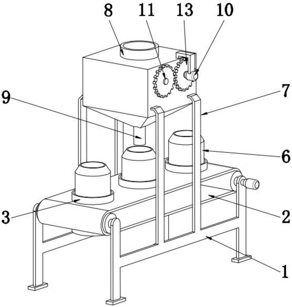本实用新型公开了一种高效生防菌剂生产包装装置,包括安装架与包装瓶主体,所述安装架的上方设有传送带主体,所述传送带主体的表面等距设有多组用于固定包装瓶主体的固定座,所述传送带主体的正上方设有物料箱,所述物料箱的底端设有下料管,还包括破碎组件、过滤组件以及防堵组件,所述破碎组件位于物料箱的内部,所述过滤组件位于所述物料箱的内部且位于所述破碎组件的下方,所述防堵组件位于所述下料管的内部,本实用新型通过破碎组件能对结块的原料进行破碎,通过过滤组件,能够对破碎后的原料过滤,通过防堵组件,使得原料进行顺利的从下料管处流出,进一步提高了防堵效果,从而能够提高原料的包装效率。