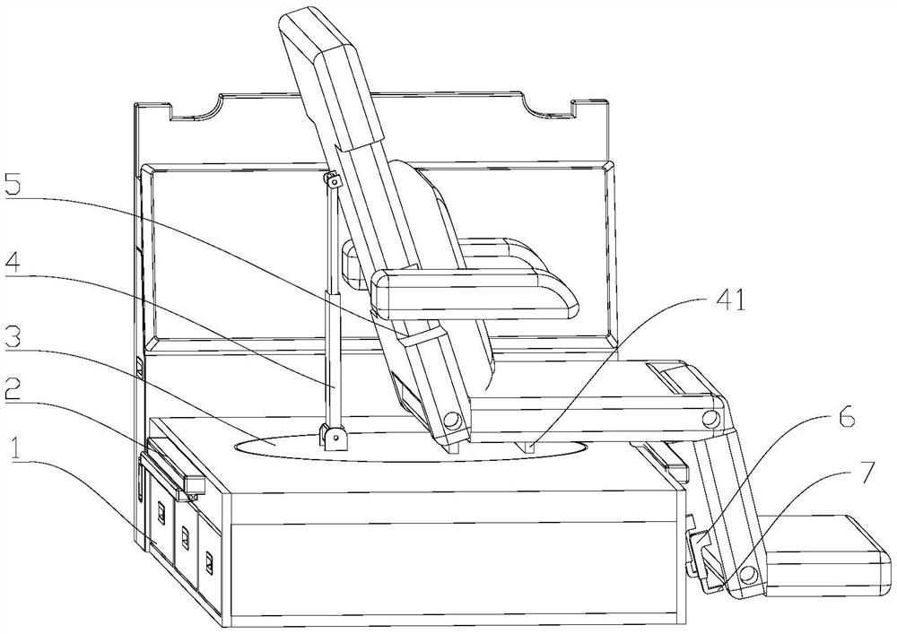 本实用新型涉及卧具技术领域,具体是旋转式床椅转换型卧具,用于解决现有技术中卧床的功能较为单一,从而不能为使用者提供更好体验感的问题。本实用新型包括床体和座椅本体,所述座椅本体包括依次铰接的背部段、大腿段、小腿段和脚踏板,所述床体顶面安装有位于竖直方向的竖直气缸,所述竖直气缸的活塞杆与背部段的底面铰接,所述大腿段的下部安装有水平气缸,所述水平气缸的活塞杆与小腿段的上部铰接,所述小腿段的下部安装有多个固定杆,所述固定杆内安装有位于脚踏板下方的伸缩弯板。本实用新型中通过上述技术方案使用者可以将座椅本体作为座椅来使用,从而可以增加该卧具的功能,进而可以为使用者提供更好的体验感。