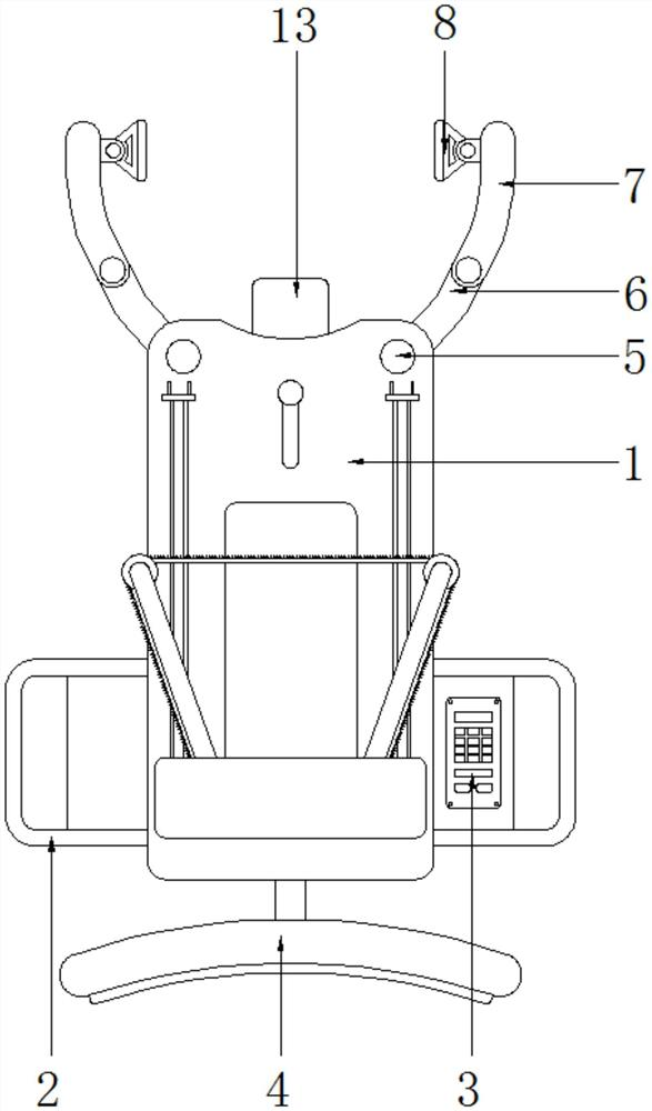 本实用新型涉及建筑施工技术领域,且公开了一种可自动调节定位的中空夹层钢管混凝土剪切切割装置,包括构造架,所述构造架的左右两侧均固定安装有握把,所述握把内侧固定安装有控制面板,所述构造架底端活动安装有推板,所述构造架顶部插接有转轴,所述转轴远离构造架的一端固定安装有转杆,所述转杆顶端活动安装有压杆,所述压杆内侧活动安装有压座,所述转杆底端固定安装有顶杆,所述顶杆底端固定安装有定位片,所述定位片内部插接有拉簧,所述构造架内部滑动安装有滑杆,所述滑杆底端固定安装有推块,所述滑杆顶端固定安装有卡板,通过在切割前使构造架保持水平,便于更好的对准切割线,从而使切割不会发生歪斜。