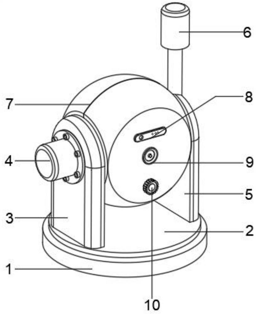 本实用新型提供了基于人工智能的非接触式体温监测视觉追踪平台,包括:旋转底座、转盘、第一支撑体;所述旋转底座呈圆盘状结构,且旋转底座的上部设置有转盘;所述第一支撑体设置在转盘的上部,且第一支撑体与转盘为一体式结构;所述电机设置在第一支撑体的侧部,且电机与第一支撑体通过螺栓固定相连接;所述第二支撑体设置在转盘的上部,且第二支撑体与转盘为一体式结构;所述指示灯设置在第二支撑体的上部,且指示灯与二支撑体为一体式结构;通过对现有装置的改进,该装置具有能够跟踪定位体温异常人员、检测效果好、使用便利的优点,从而有效的解决了本实用新型在背景技术一项中提出的问题和不足。