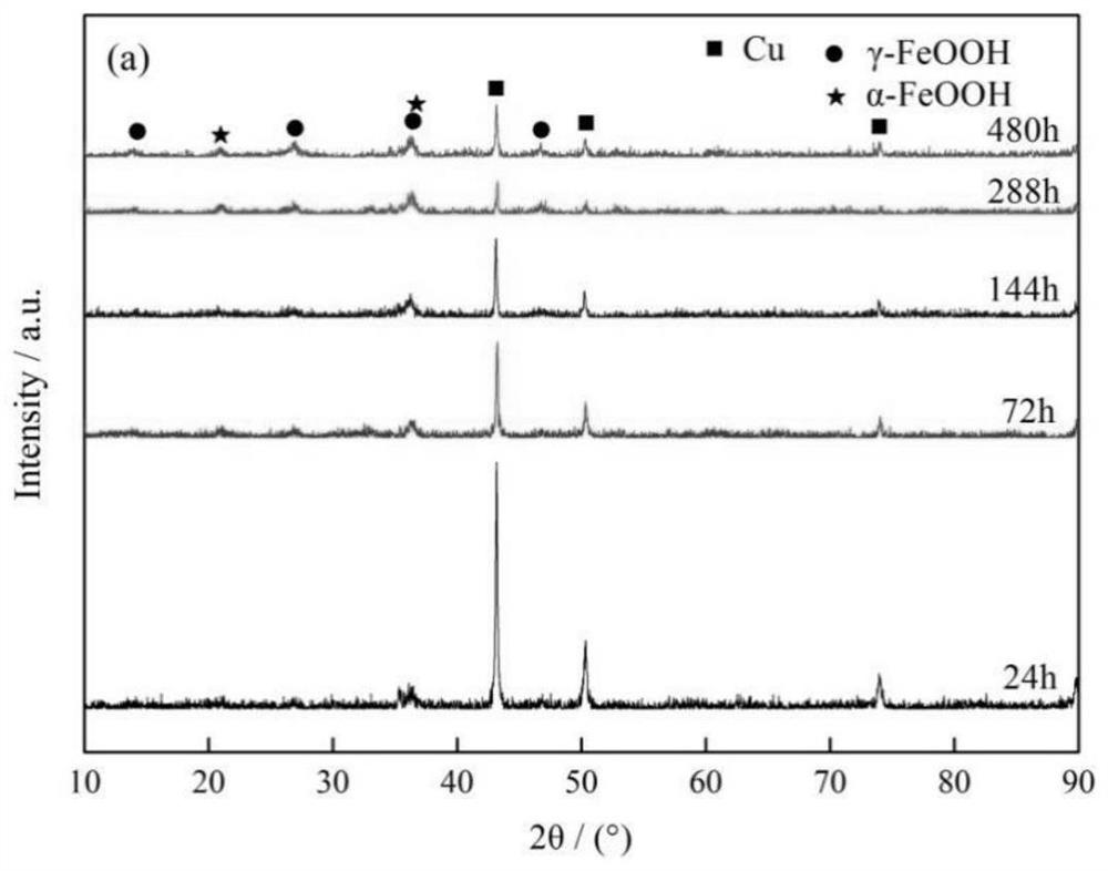 本发明公开了一种适用于工业大气环境的耐候钢表面稳定化处理剂及处理方法,属于钢材防腐技术领域,耐候钢表面稳定化处理剂按照重量百分比计,包括如下原料:CuSO4 0.8~1.2%、Cr2(SO4)32.8~3.2%、NaHSO3 0.5~0.7%、Fe3O4 0.08~0.12%,余量为去离子水,经过稳定化+水处理后元素Cu在耐候钢表面富集,在模拟工业大气介质中的腐蚀速率大大降低,加速了稳定致密锈层的形成,同时避免了腐蚀初期锈液流挂与飞散等污染大气环境的问题。该操作方法简单,成本低,适用于工业发达的工业大气环境。