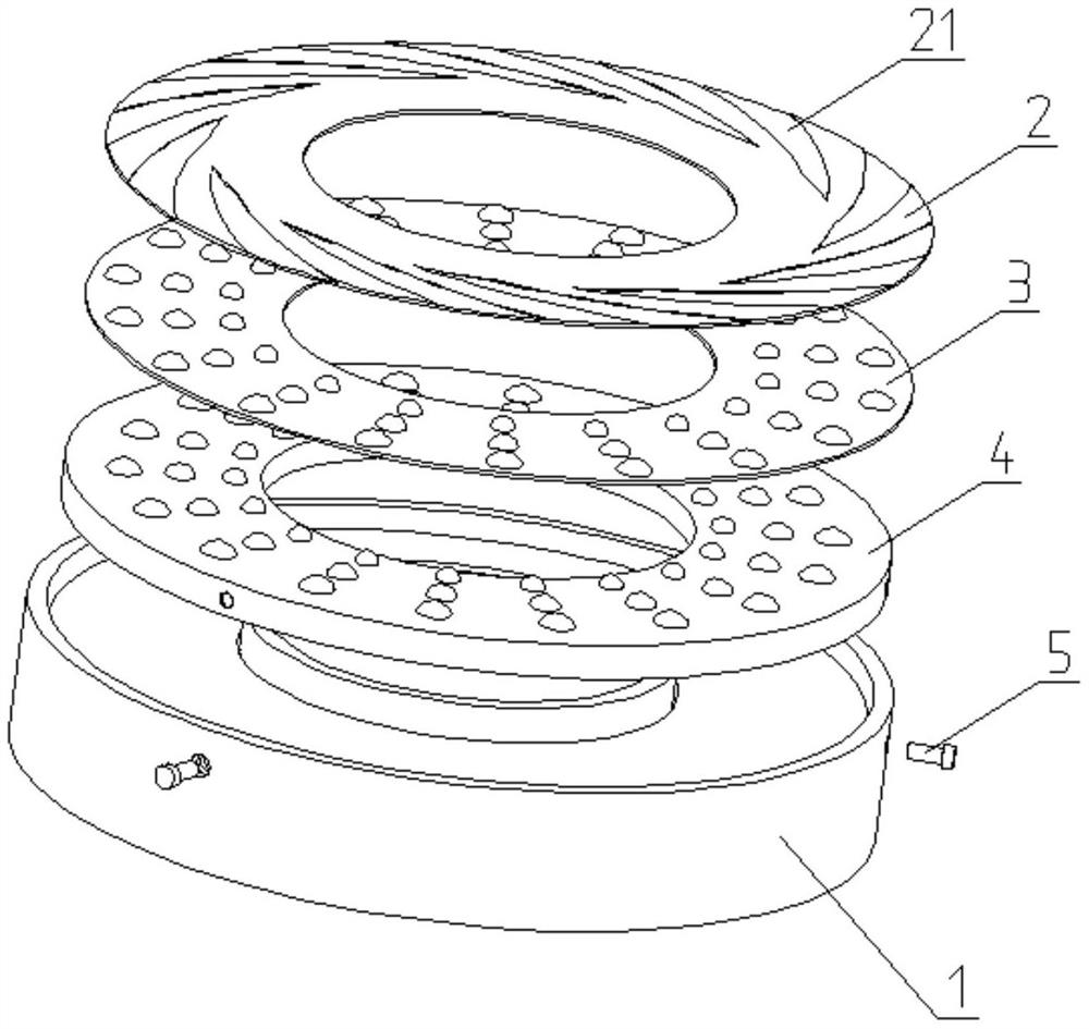 本实用新型公开了一种金属鼓泡式箔片干气密封结构,包括动环、静环,所述动环、静环中至少一个的密封端面为金属鼓泡式箔片端面,所述金属鼓泡式箔片端面包括环本体、依次设置在环本体端面上的第一鼓泡箔片、第二鼓泡箔片、平箔片,所述平箔片表面具有动压槽。本实用新型的目的在于提供一种金属鼓泡式箔片干气密封结构,以解决现有技术中干气密封技术在不稳定运行服役环境中因启停、振动等出现的失稳、失效问题,实现保证密封系统在多变工况中较强的自适应性和稳定运行能力的目的。
