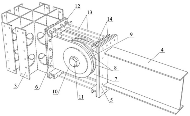 摘要:一种自复位型刚度自适应控制装配式梁柱节点,预制柱(1)和预制梁(2)通过柱T形连接板(6)、梁T形连接板(7)和销轴(11)铰接连接,所述柱T形连接板的第一耳板(6‑2)和梁T形连接板的第二耳板(7‑2)之间安装可以实现变刚度的鞍形圆板(8)和橡胶圆板(9),所述高弹性件(13)通过夹具(14)张拉固定栓接于柱T形连接板的第一立板(6‑1)与梁T形连接板的第二立板(7‑1)上的U形卡槽(12)之间。本发明实现了不同强度外荷载作用下结构的自适应控制,避免了构件发生较大的塑性损伤,同时在震后基本可以实现完全复位,节点全程干作业施工,连接可靠,安装方便,可快速更换。