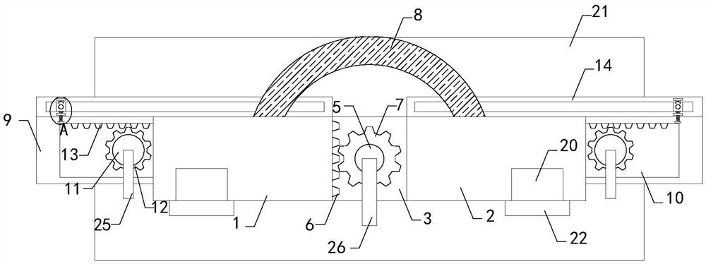 摘要:本实用新型涉及多功能直尺技术领域,具体为一种可多角度调节的多功能直尺,包括第一横板、第二横板、第一连接杆和第二连接杆,位于前侧的第一连接杆前端设置有旋转轴,第一横板的右端固定设置有第一齿条,旋转轴的圆周外壁上套装有第一齿轮,第二横板的顶端设置有环形杆,第一横板的左端和第二横板的右端分别设置有第一固定杆和第二固定杆,第一固定杆的前端和第二固定杆的前端均设置有圆轴,各圆轴的圆周外壁上均套装有第二齿轮,第一固定杆的内侧壁和第二固定杆的内侧壁均设置有第二齿条,方便对所需角度的位置进行固定,减少对绘画的角度造成偏差的影响,降低局限性,方便对直尺的长度进行调整,加快绘画速度,提高效率。