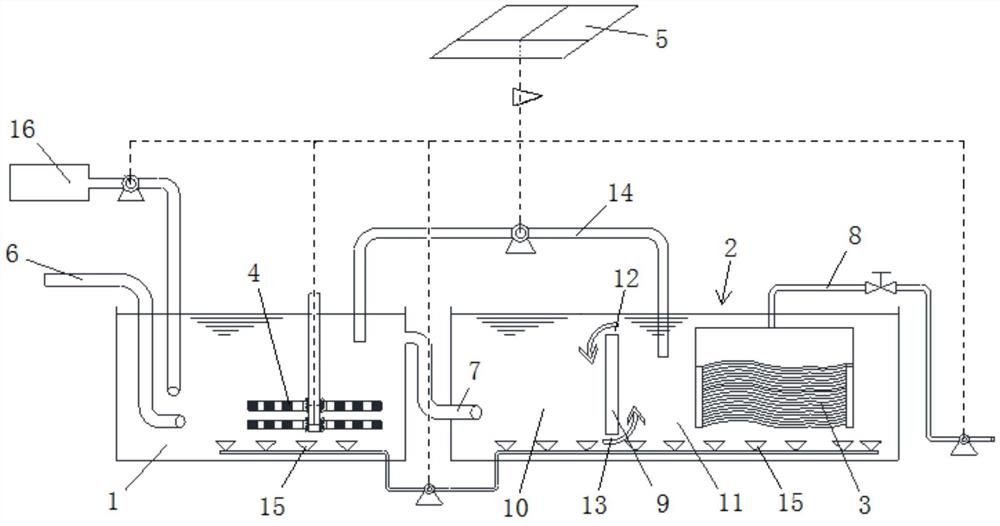摘要:本实用新型属于膜生物反应器技术领域。为了解决现有膜生物反应器运行过程中,存在大曝气量对膜组件冲击破坏以及成本高和能耗大的问题,本实用新型公开了一种太阳能光伏发电联合膜生物反应器一体式装置。该装置包括缺氧池、好氧池、膜组件、加热板组件和太阳能光伏发电单元;缺氧池设有进液管,好氧池位于缺氧池的下游并且两者通过连接管连通,将缺氧池中的液体引流至好氧池中;加热板位于缺氧池中,太阳能光伏发电单元与加热板连接,以提供电能驱动加热板组件释放热量;膜组件位于好氧池中,好氧池还设有出水管用于将经过膜组件处理的水引出。采用本实用新型的太阳能光伏发电联合膜生物反应器一体式装置可以提高对膜组件的保护,降低成本和能耗。