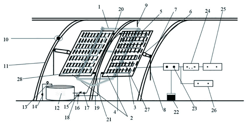 摘要:一种PV/T遮阴装置,其目的是在对温室大棚遮阴的同时,实现光热、光电的转化利用,以及消除作物光合作用与光伏发电之间的矛盾冲突,改善作物生长条件,包括支撑架、PV/T板、铁环、螺丝杆套、绳环、拉绳、传动装置、温度传感器、日照强度计、流量计、阀门、水泵、蓄热箱、进水管、出水管、三通阀、蓄电池、控制器、逆变器、交流负载、直流负载。温度传感器实时监测室内的温度变化,通过龙骨两侧的PV/T装置伸展收缩的方式调整遮阴面积,同时实现将一部分PV/T转化为电能和热能的功用。能够实现对温室的遮阴,而且实现光电、光热的转化利用,降低了室内温湿度变化的波动范围,为室内作物生长提供了良好的生长环境。