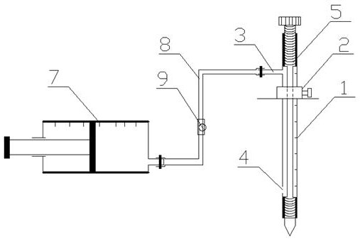摘要:本实用新型公开了一种人工湿地基质中水质取样装置,它包括两端敞口的取样管和活塞式真空取样器,所述取样管的上下两端内壁上均开设有内螺纹,取样管下部内螺纹的上部侧壁上开设有进液孔,取样管上部内螺纹的下方侧壁上设置有导流管,导流管通过软管与取样器相连接,软管的两端分别通过管卡固定在导流管和取样器上;取样管的内腔中装配有支杆,支杆的顶部和底部均设置有与取样管内壁上的内螺纹相适配的外螺纹,支杆的中部外径小于取样管的内径;取样管的外壁上套装有定位卡环。本实用新型通过采样装置精准采集基质中的水样,并将水样注入检测装置进行检测,全程为无氧环境,样品不与大气接触,保证了检测数据的精确度。