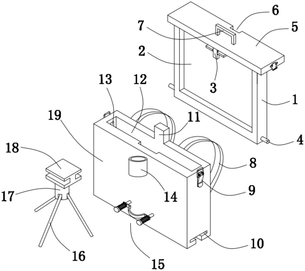 摘要:本实用新型公开的一种新型土木工程测绘装置,包括移动箱、支架机构和收纳机构,所述移动箱的后部设有背带,所述支架机构包括滑接座,所述立柱底部通过销轴连接有支撑杆,所述移动箱的前部上侧还设有用于插接立柱的圆筒,所述移动箱的前部下侧还设有用于限定支撑杆位置的限位卡箍机构,所述收纳机构包括收纳板,所述收纳板前部的凹槽顶部设有夹紧机构,所述收纳板收纳于移动箱中部的收纳腔内,所述收纳板下部两侧的销轴滑接于收纳腔两侧的竖直槽内,所述移动箱的后部上端设有支撑于收纳板后部的支撑板。本实用新型支架机构和收纳板可张开后使用,便于测绘作业;支架机构和收纳板可完成收纳,使得移动箱可通过背带背起,便于携带。