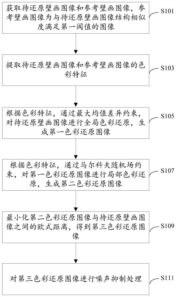 摘要:本发明提供了一种壁画图像色彩还原方法、装置、存储介质及计算机设备,该方法包括获取待还原壁画图像和参考壁画图像;提取待还原壁画图像和参考壁画图像的色彩特征;根据待还原壁画图像和参考壁画图像的色彩特征,通过最大均值差异约束,对待还原壁画图像进行全局色彩还原,生成第一色彩还原图像;通过马尔科夫随机场约束,对第一色彩还原图像进行局部色彩还原,生成第二色彩还原图像;最小化第二色彩还原图像与待还原壁画图像之间的欧式距离,得到第三色彩还原图像;对第三色彩还原图像进行噪声抑制处理。本申请能够有效保持壁画图像中原有结构信息,对褪色、变色区域整体还原效果较好,提高了石窟壁画色彩还原的效果。