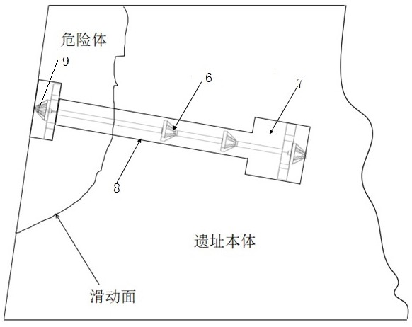 摘要:本实用新型提出了一种土质遗址锚固系统,包括设置在危险体和遗址本体中的锚孔,锚孔的横截面为T形,锚孔底部的灌浆体设置在遗址本体中且灌浆体的直径大于锚孔前端的直径;锚孔内设有锚杆,锚杆的锚头固定设置在危险体内,锚杆包括拉杆、套杆和米字板,拉杆的外部套设有套杆,拉杆的底部套设有米字板,米字板为组装板,拉杆的尾部固定有与米字板相匹配的承压台,承压台与米字板可拆卸连接,米字板和承压台设置在灌浆体内。本实用新型的米字板使得锚杆在拉拔过程中充分利用了浆体和遗址体的围压,大大提升锚杆的锚固力可抗大变形性能。本实用新型操作简单、安装方便,维护保养便捷,有利于大范围推广使用。