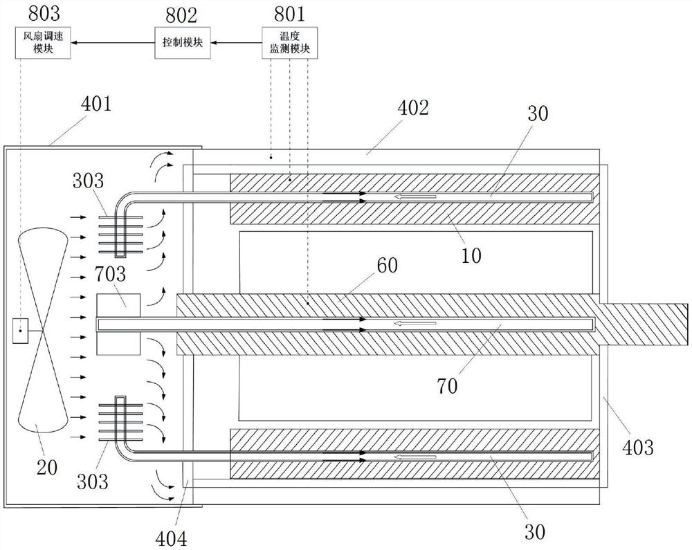 摘要:本实用新型属于电机设备技术领域。为了解决由于电机内部热量无法快速引出,而对电机内部设备造成损坏的问题,本实用新型公开了一种基于热管冷却的电机。该电机包括定子、风扇和定子热管;其中,所述风扇与所述定子沿轴向间隔布置,所述定子上设有沿轴向开设的定子热管孔,所述定子热管的定子热管蒸发段位于所述定子的定子热管孔中,所述定子热管的定子热管冷凝段伸出至所述定子的外部,位于所述定子与所述风扇之间。本实用新型的电机,可以直接将位于电机内部定子中的热量进行快速的引出,完成对定子的快速冷却降温,从而避免电机内部设备长时间处于高温状态而发生损坏。