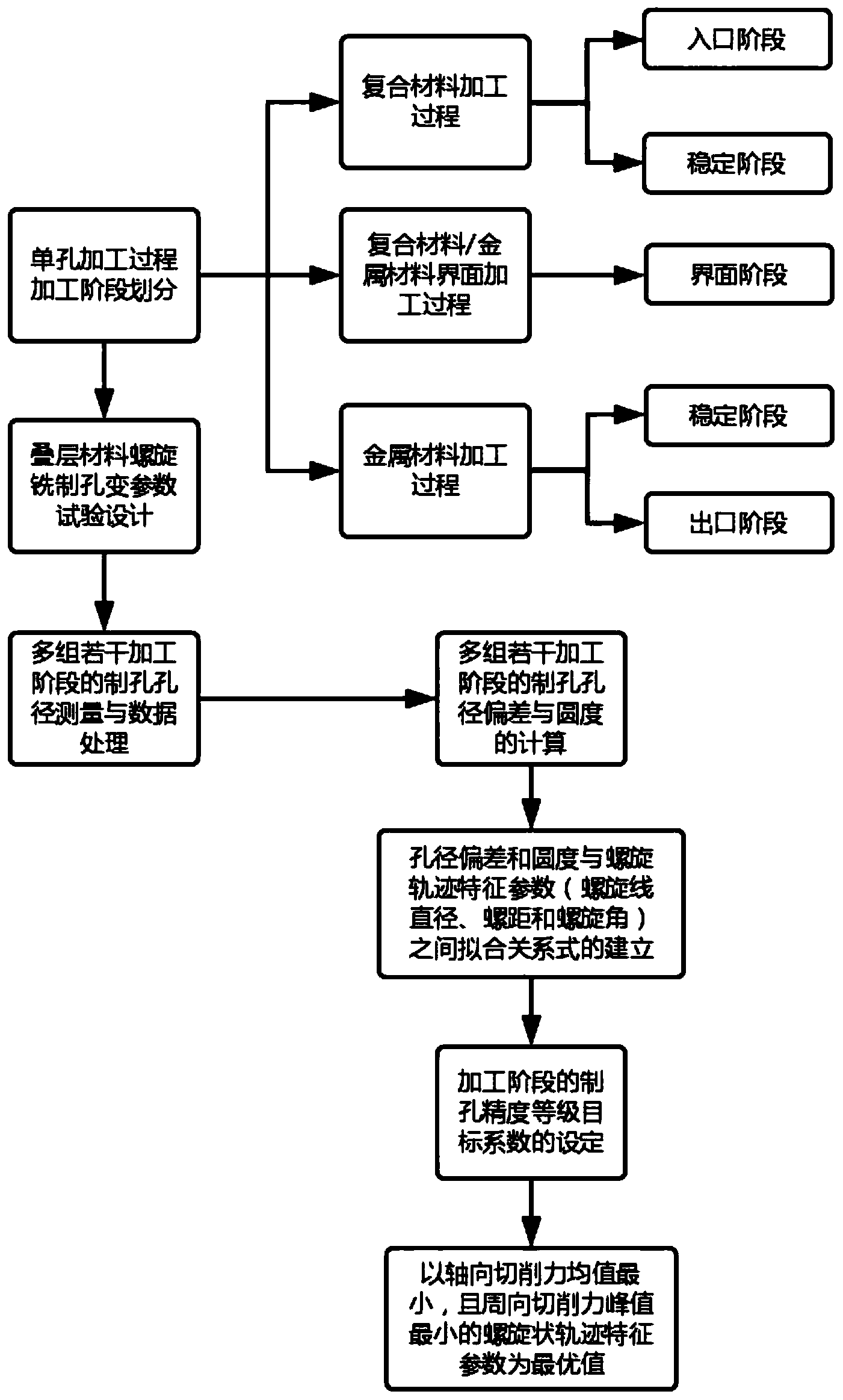 摘要:本发明公开一种叠层材料制孔加工轨迹规划方法,包括以下步骤:1)沿轴向将叠层材料加工过程划分入口、稳定、界面和出口等加工阶段;2)测量、整理制孔精度数据;3)分析各阶段制孔精度变化规律,建立孔径偏差、圆度与螺旋状轨迹特征参数之间的拟合关系式;4)以轴向切削力均值最小,且周向切削力峰值最小为目标,获得螺旋状轨迹特征参数的最优值。本发明为解决叠层材料通孔加工呈“倒锥形”问题提供途径,通过分析单孔加工过程中关键阶段的制孔精度变化规律,以满足出口阶段精度等级要求为核心目标,进行螺旋运动轨迹规划,最终实现工艺参数优选,这样既能提高单孔加工过程的整体制孔精度,又有利于降低整体切削力水平,以延长刀具寿命。