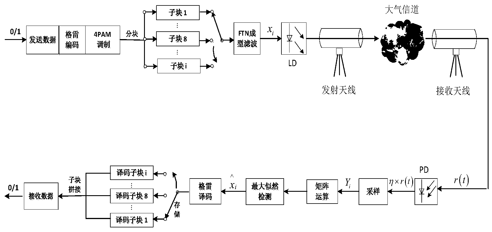 摘要:一种WO‑FTN传输系统中的分块矩阵干扰消除方法,在发送端将数据信号进行分块,再分别将每个子块中的数据通过FTN成型滤波器生成为FTN信号,然后根据成型滤波器系数计算出FTN传输特性系数矩阵,并将该矩阵的逆与接收到的数据子块相乘,从而降低因FTN传输带来的干扰,提高系统的误码性能。同时,该方法在执行过程中,由于成型滤波器一致,FTN传输特性系数矩阵的逆相同,因此在整个信息传送过程中对于矩阵的求逆运算只需计算一次,从而可以降低系统的整体计算复杂度。