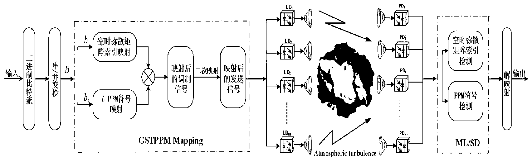 摘要:一种广义空时脉冲位置调制方法,主要包括对二进制信息块进行空间域和信号域映射、接收信号的检测与计算复杂度对比、广义空时脉冲位置调制系统误码率上界的计算。其中,空间域映射是将激光器序号依据秩最大化准则映射为广义空时弥散矩阵块,信号域映射则是在不同的激活激光器上映射不同的脉冲位置调制符号。映射后的信号由光学天线发送出去,在接收端利用球形译码算法进行广义空时弥散矩阵索引和数字调制信号的检测。利用联合界技术推导了广义空时脉冲位置调制的误码率上界。该方案的提出在保证不增加成本的前提下,极大的提高了系统的传输速率和误码性能,降低了系统的计算复杂度。
