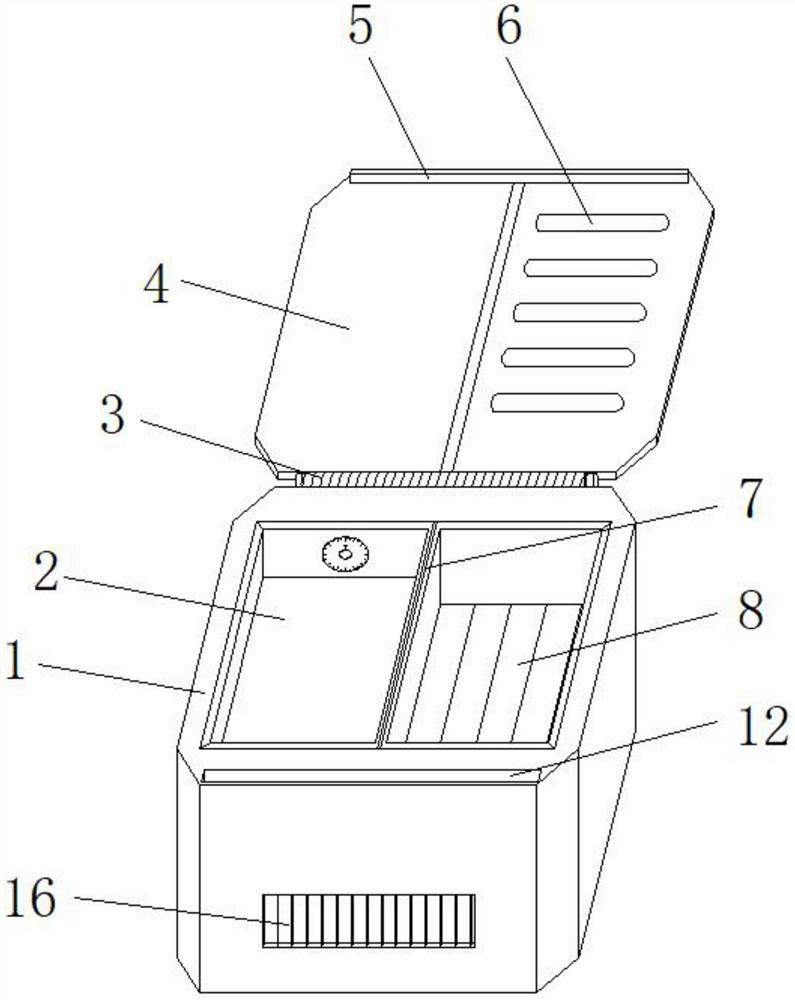 摘要:本实用新型公开了一种智能药箱,包括箱体和定时闹钟,所述箱体的一侧表面中部设置有播音口,所述箱体的内部中部固定连接有隔离板,所述箱体的顶端一端中部开有限位槽,所述箱体的内部一端卡接有储药盒,所述储药盒的表面两端开有把手槽,所述储药盒的内部一端嵌接有定时闹钟,所述箱体的内部另一端卡接有器械盒。该种实用新型通过设置有储药盒、定时闹钟、把手槽和播音口,方便通过多个储药盒能够将不同类型的药物进行分类放置,通过把手槽方便将多个储药盒进行分离,通过定时闹钟设定好需要服药的时间,当下次时间到时,通过定时闹钟传递信号给播音口,通过播音口发出声音用于提醒下一次服药的时间到了,方便提醒人员进行服药。