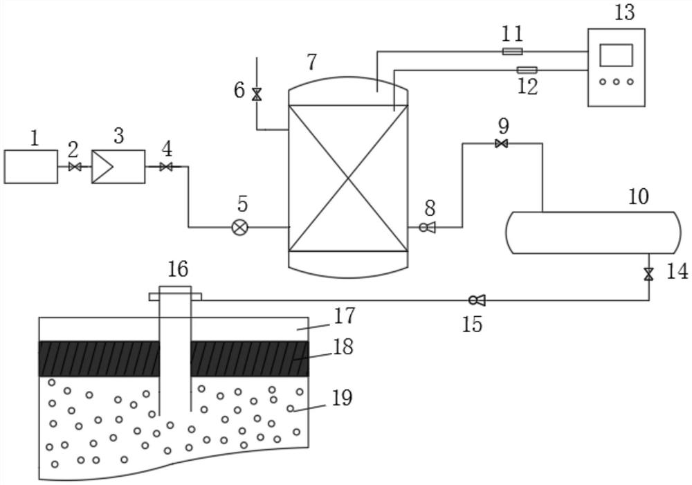 摘要:本实用新型公开了一种二氧化碳地层封存系统。该系统包括:气体预处理单元,用于将二氧化碳气体收集后再进行预冷、增压处理;水合反应单元,用于将处理后的二氧化碳与水合剂输送至设定压强、温度的闭合空间内反应生成二氧化碳水合物;水合物封存单元,用于将二氧化碳水合物输送至煤/油气采空区以水合物的形式进行地层封存;其中,气体预处理单元、水合反应单元、水合物封存单元依次通过管道连接。本实用新型系统对二氧化碳气体的存储效率高、便于储存和运输,二氧化碳气体存储过程具有很强的安全性和经济性,并且,本实用新型利用地层压力实现二氧化碳气体的封存,进一步提高了二氧化碳的封存效率。