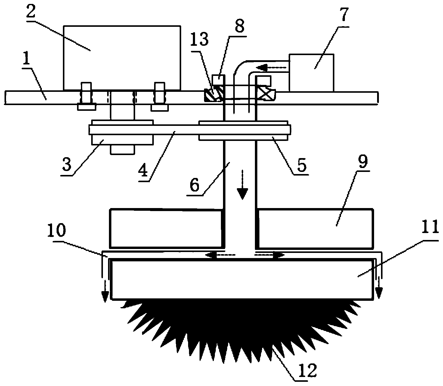 摘要:本发明公开了一种抛光装置,涉及零件抛光技术领域,包括动力旋转装置、旋转轴、补水盘、第一磁铁、磁性复合流体和水汽产生装置,动力旋转装置带动旋转轴进行转动,旋转轴呈管状,水汽产生装置与旋转轴的一端连接,旋转管的另一端与补水盘的一面固定连接,补水盘的另一面与第一磁铁固定连接,补水盘上设置有通气结构,补水盘在与旋转轴固定连接处设置有一通孔,补水盘的边缘沿远离旋转轴方向延伸,磁性复合流体吸附在第一磁铁上,水汽产生装置产生的水汽进入旋转轴的内部,经过通孔和通气结构后输送至磁性复合流体周围对其进行均匀补水,延长了磁性复合流体在抛光过程中的使用寿命,避免其频繁的更换,降低加工成本。