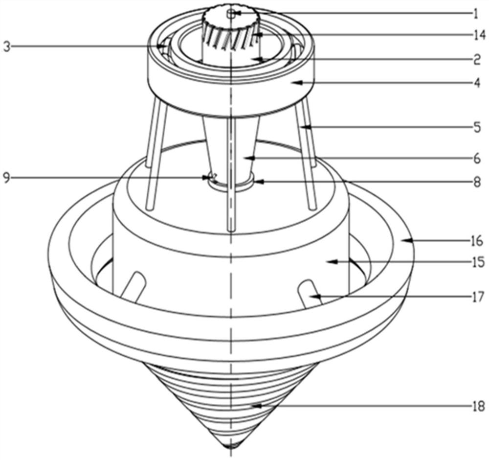 摘要:一种流体螺旋推力驱动的推进器,本实用新型涉及运输技术领域中用于水下居住或作业的设备技术领域;倒锥形空腔结构的外环壁上设有内嵌螺旋叶片。利用流体对推进器空腔上的内嵌螺旋叶片的作用,其水平分力沿着推进器切向产生旋转力矩,作用特征是旋转力矩对推进器产生旋转的机械能使推进器在水面上旋转,其向上分力与沿推进器放置方向相同,方向与其中心轴平行垂直作用在内嵌螺旋叶片上,产生浮力与推进器空腔、叶形平衡器的空腔配合提升推进器漂浮性能;内嵌螺旋叶片在推进器空腔外侧体型的变化规律使推进器在流体作用下旋转时更加平稳。