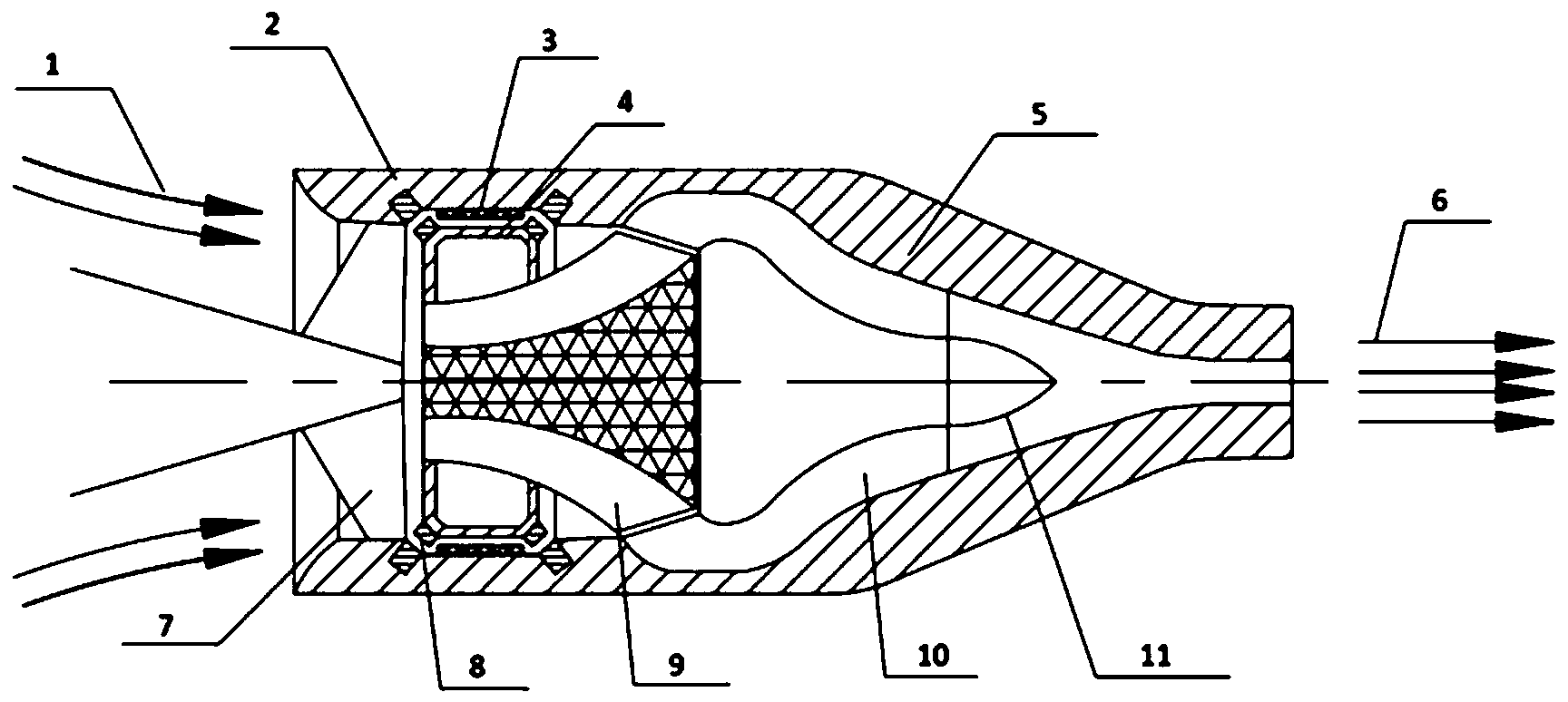 摘要:一种双定子驱动的动力单元一体化螺旋混流式喷水推进泵,本发明涉及喷水推进技术领域,磁悬浮轴承由一号磁体和二号磁体构成,一号磁体嵌设固定在位于绕组线圈两端的壳体内壁上,二号磁体固定在永磁体的两端上,同一端的一号磁体与二号磁体同极相斥设置;壳体的一端为水体入口,另一端上一体成型有整流喷管,整流喷管的内壁一体成型有数个导叶叶片,整流喷管内设有导流装置,整流喷管的另一端为水体出口;水体入口内部的壳体中设有固定支架。电能转化率高,提高对潜水艇的推进效率、损管冗余度,并有效节省舰艇内的空间,有效的屏蔽和降低辐射噪声。