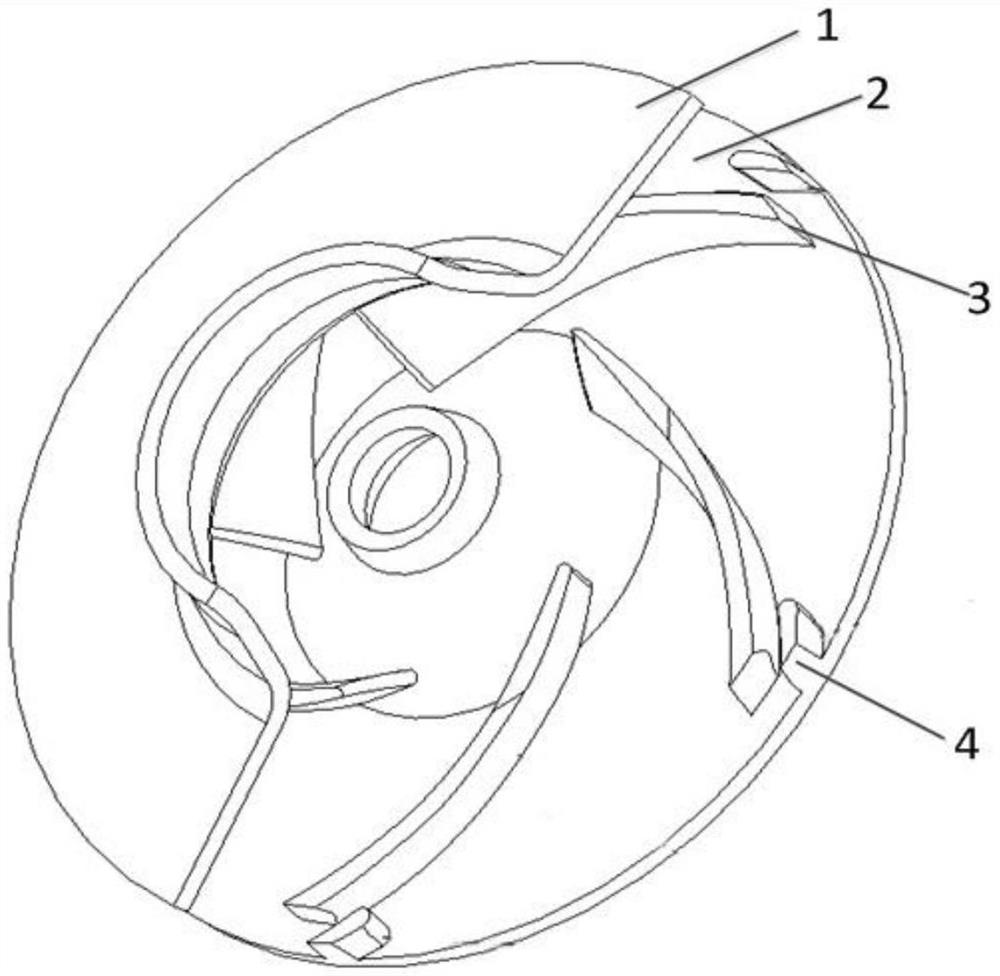 摘要:本实用新型公开一种带分离式叶片的离心泵叶轮,包括带有进口的前盖板、带有轴套的后盖板以及前盖板与后盖板之间均匀分布的N组叶片;每组叶片包括弧形的前叶片和后叶片,前叶片和后叶片的弧度相同;后叶片位于前叶片弧形结构的外侧,且后叶片外端边缘与后盖板边缘平齐;前叶片内端边缘紧贴轴套。本申请通过将叶片分为分离布置的前叶片和后叶片,流体通过相邻叶片之间的通道末端时,因为后叶片位于前叶片弧形外侧,且两者分离布置,流体通过离心力的作用在前叶片外缘会发生分流,从而使作用在蜗壳隔舌上的水流冲击分流错开,以此减小蜗壳隔舌上的冲击力,使离心泵的噪声大大下降,并延长离心泵的寿命。
