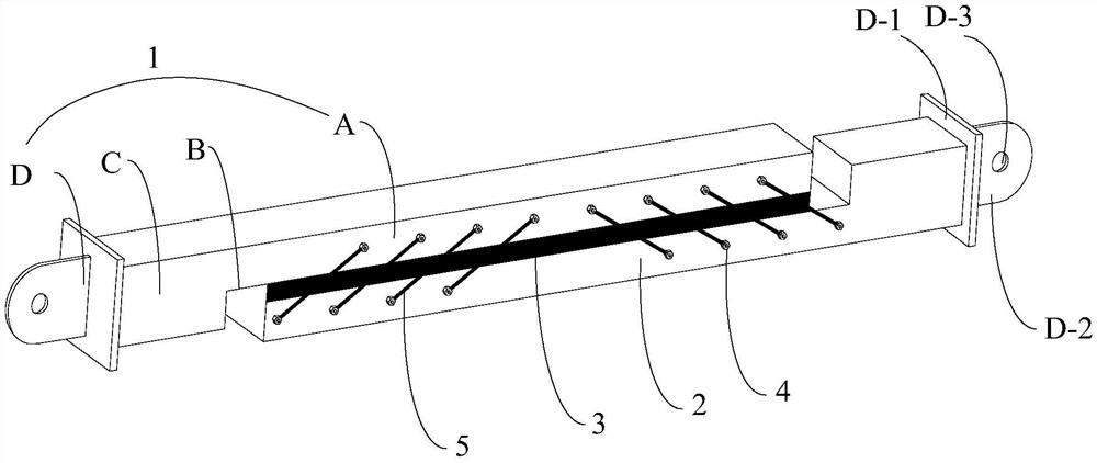 摘要:本实用新型公开了一种自复位黏弹性阻尼支撑,该支撑的上部钢构件翼缘段粘接侧、下部钢构件翼缘段粘接侧之间通过黏弹性材料粘接以构成阻尼段;翼缘段端部与相邻加强段的限位凸起正对且彼此间隔为空隙段;阻尼段的牵拉侧在垂直粘接侧方向上的中心线上镜像对称分布有一合金索组,形状记忆合金索与所述中心线之间呈设定夹角,各形状记忆合金索两端分别穿过上部钢构件牵拉侧的导线孔、下部钢构件牵拉侧的导线孔并固定在限位端头上,所述限位端头顶持在与其相邻的导线孔处。本实用新型构造简单、运动机制明确,能很好地协调变形和运动,不论是在单向拉压还是往复荷载如地震作用下都能表现出较好的性能。