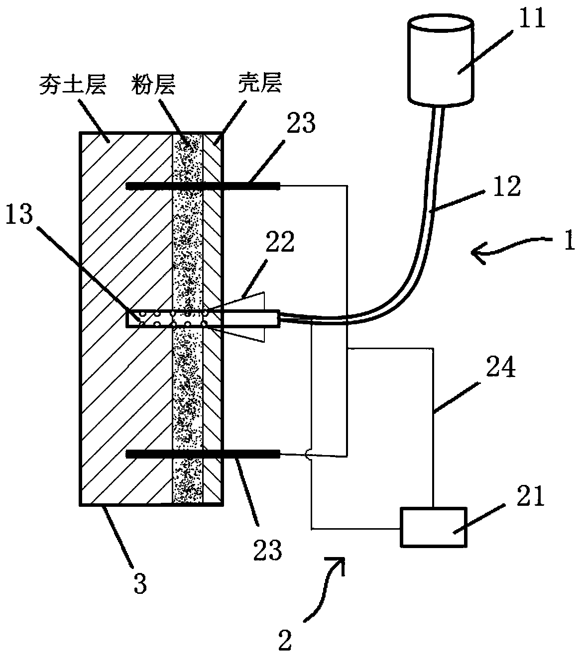 摘要:本发明属于土遗址加固技术领域。为了解决常规方法对土遗址片状剥离进行加固处理时,存在加固效率低和加固效果不好的问题,本发明公开了一种用于土遗址片状剥离加固的装置。该装置包括供液单元和供电单元;供液单元包括供液源、供液管和供液头,供液管两端分别与供液源和供液头连接,将供液源中的加固液引流至供液头处,供液头的自由端插装固定在待加固土遗址的内部;供电单元包括直流电源、阳极和阴极,阳极和阴极分别与直流电源的正极和负极连接,阳极和阴极保持间隔同时插装固定在待加固土遗址的内部;阳极与供液头保持接触连接。采用本发明的装置进行土遗址片状剥离加固,可以在一定深度范围内进行同步定向渗透加固,提高渗透的可控性和效果。