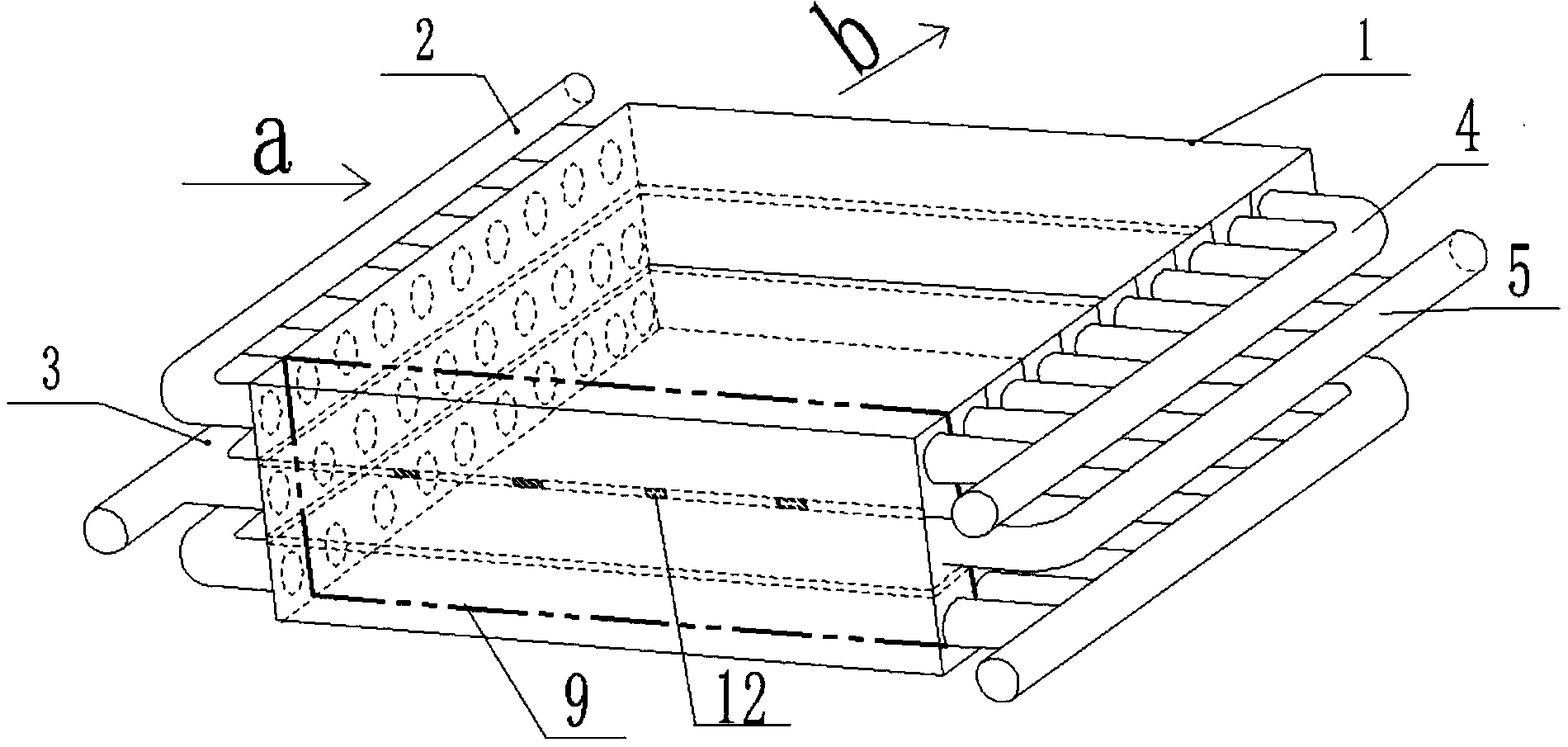 摘要:本实用新型提供了一种双面冷却的多流道式膜蒸馏装置,包括壳体,壳体内设置有两层水平设置的冷壁将壳体的内腔从上至下依次分隔成上冷流区、热流区和下冷流区,上冷流区、热流区和下冷流区内沿流体流动的方向并排设置有多个隔板;热流区内水平设置有两层多孔疏水膜将热流区的上下两端分隔出气隙通道,气隙通道内设置有多个肋片,上冷流区和下冷流区的相对两侧的壳体上均设置有冷却水进水管道和冷却水出水管道。本实用新型通过在气隙通道中设置肋片,能够加强水蒸气冷凝的作用,并且能够起到支撑多孔疏水膜的作用,降低多孔疏水膜的弯曲度,减少通量损耗;隔板将上冷流区、热流区和下冷流区均分割成多个平行的流道,且可提高通量。
