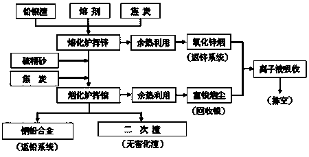 摘要:一种熔化‑烟化法高效回收铅银渣中银的方法,其步骤为:(1)将铅银渣按其中铁、钙、镁的含量配入熔剂和焦炭,混合后干燥;(2)混合料加入熔化炉内,进行熔化和还原挥发锌作业,反应后的熔体熔融状态转入烟化炉;(3)按烟化炉中熔体按其中有价金属的含量,配入硫化剂和焦炭;(4)控制烟化富氧浓度、反应温度、反应时间及鼓风量,进行熔融硫化改质和挥发银作业;(5)熔化炉和烟化炉产生的烟气进入各自的收尘系统,收集氧化锌烟尘和富银烟尘;(6)烟化炉中的炉渣和熔体分别水淬;(7)收集烟尘后的烟气汇合后进入烟气处理系统;(8)氧化锌烟尘返湿法炼锌系统,水淬熔体返火法炼铅系统,富银烟尘提取银。