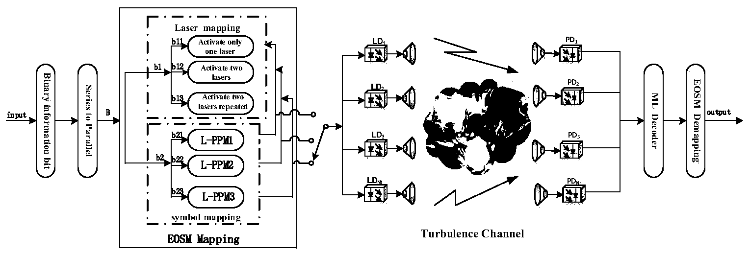 摘要:一种适合于对数正态湍流信道的增强型光空间调制方法,主要包括对二进制信息块进行空间域映射和信号域映射、接收信号的检测与解映射、增强型光空间调制系统误码率上界的计算。其中,空间域映射是将激活的不同激光器序号组合分为三类,信号域映射则是依据映射规则确定不同类激活激光器上映射的脉冲位置调制符号。映射后的信号由光学天线发送出去,经过大气湍流信道、接收光学天线后由光电探测器转换为电信号。再利用最大似然译码检测算法完成激光器序号和数字调制信号的检测,并经相应的解映射后即可恢复发端比特信息。进一步,利用联合界技术推导了增强型光空间调制的误码率上界。