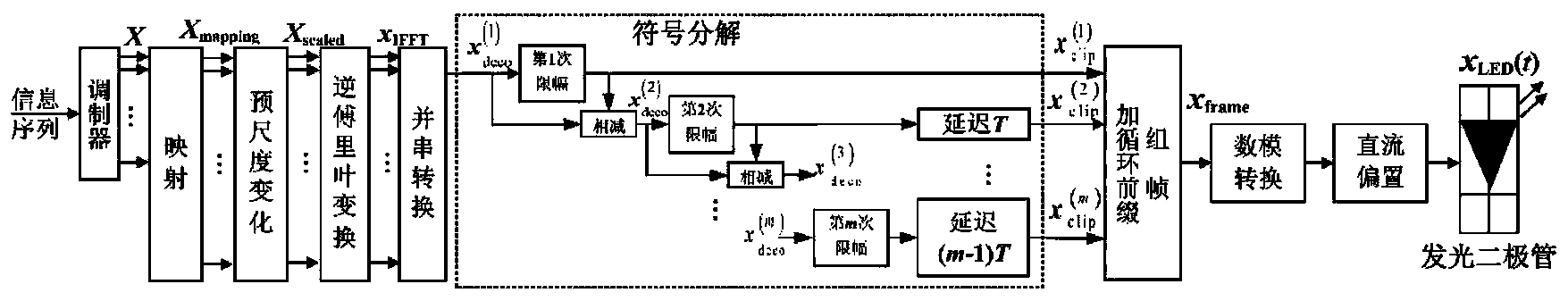 摘要:一种抑制LED非线性失真对可见光通信性能影响的方法,主要步骤是:(1)调制符号序列映射,输出信号满足厄米特对称性;(2)对映射信号乘以尺度变化因子;(3)进行IFFT,然后对光OFDM符号限幅分解,得到幅度较小的多个分解符号;(4)分解符号串行组帧;(5)接收端依次串行接收一帧中的所有光OFDM符号,分别延迟至符号对齐;(6)对应位相加,合并为一个光OFDM符号。本发明易于调控光OFDM符号平均功率、同步容易、实现简单、易于部署。