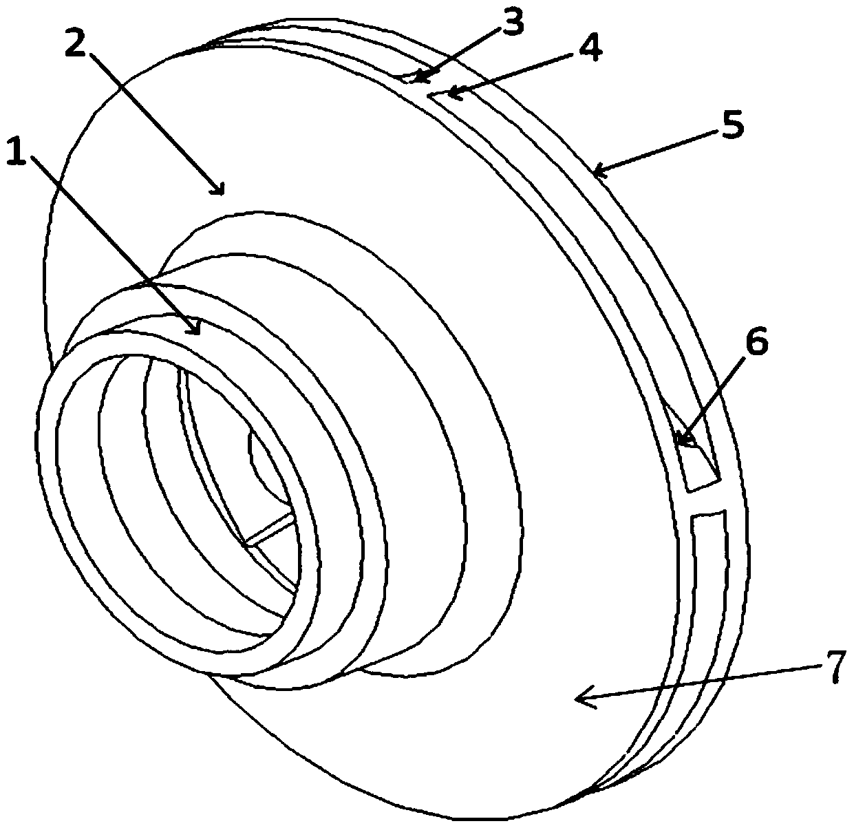 摘要:本实用新型公开了一种离心泵叶轮,包括口环、前盖板、叶片工作面、叶片背面、后盖板、缝隙和叶轮主体,叶轮主体的一侧外壁上固定连接有口环,叶轮主体的两侧外壁上分别固定安装有前盖板和后盖板,叶轮主体的两侧外壁上设置有叶片工作面和叶片背面,叶片工作面和叶片背面的外壁上分布开设有缝隙;该降噪方法是提供一种全新的叶轮结构来对离心泵噪声进行控制,在叶轮的每个叶片后缘上进行开缝处理,可以减小叶片工作面和背面的压力差,进而减小叶片出口处的流动分离与尾流等复杂流动,在尽量不影响其性能以及不增加成本的前提下进行设计优化,可批量生产,开缝设计不仅提高离心泵的寿命,同时降低对环境的危害。