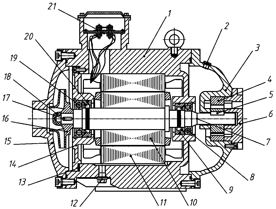 摘要:进口带叶轮增压供液的液压电机齿轮泵,是电机、离心泵叶轮和齿轮泵的一体化集成体,进油口设置叶轮,油液经增压后到达齿轮泵吸油口,很好的改善了齿轮泵的吸油不足问题,特别在较高转速时,齿轮泵吸油效率的提升更为明显,同时也避免了因吸油不足产生的气穴噪声;电机转子(10)通过过盈配合安装在主轴(7)上,以第一轴承(8)和第二轴承(19)支撑在壳体(1)上,齿轮组(4)安装在前端盖(3)上,通过第一平键(5)与主轴(7)相连,叶轮(16)设置在后端盖(15)和内端盖(14)之间,并用第二平键(17)与主轴(7)连接,主轴(7)两端由第一密封件(9)和第二密封件(20)密封。