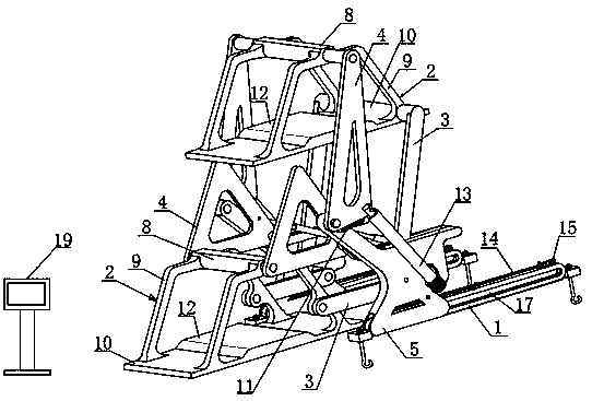 摘要:本发明公开了一种三层立体车库;其包括基座、移动支撑架、车位机架、车辆存取驱动机构和控制台;基座包括两个平行间隔布设的轨道座,轨道座固定在地面上;移动支撑架分别设在两个轨道座上;车位机架中的二层车位机架和三层车位机架均包括车辆吊篮以及铰接在车辆吊篮两侧的直连接杆和三角形框架;直连接杆和三角形框架的端部与移动支撑架铰接,三层车位机架的车辆吊篮位于二层车位机架的车辆吊篮上方;车辆存取驱动机构包括横移驱动机构、吊篮驱动机构;控制台与横移驱动机构和吊篮驱动机构电连接;本发明基于地面上部空间建造三个车位于一体的三层立体车库,可灵活的建造在巷道或地形弯曲区域,应用更加灵活。