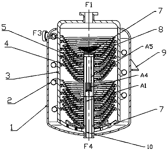 摘要:一种高效螺旋管换热器,抛物面分布螺旋换热管(5)叠加安放在内壳体(3)内部,与位于中心位置的主外管(A3)连接,抛物面分布螺旋换热管(5)被抛物面导流支撑架(4)支撑,内壳体(3)底部有内壳体支撑架(6)支撑在外壳体(1)的底部,换热管道分流装置(10)固定在内壳体支撑架(6)上,主外管(A3)的上顶端装有反流堵头(8),反流堵头(8)上方安装有稳流分布罩(7);抛物面导流支撑架(4),由圆环筋板(B1)和抛物面纵向筋板(B2)构成主体部分,最上圈圆环筋板(B1)上面周向均布有固定卡钩(B3),抛物面纵向筋板(B2)之间分布有抗重力导流叶片(B4),抛物面纵向筋板(B2)内侧分布有螺旋管换热管卡扣(B5)。