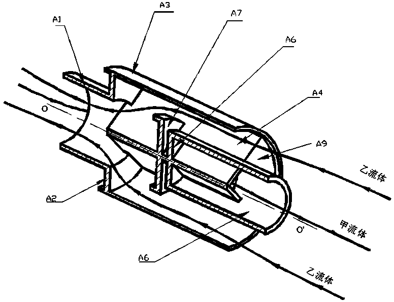 摘要:一种换热管道分流装置,内管1(A1)和内管2(A5)分别被套放在主外管(A3)内部,均与主外管(A3)同轴,内管1扇形前堵头(A2)安放在内管1(A1)深入主外管(A3)的外缘位置,与内管1(A1)、主外管(A3)相连接,内管1扇环形后堵头(A7)安放在内管1(A1)的末端;内管2扇形前堵头(A9)安放在内管2(A5)深入主外管(A3)的外缘位置,与内管2(A5)、主外管(A3)相连接,内管2扇环形后堵头(A6)安放在内管2(A5)的末端;周向均布对称分流板(A 4)以管道轴心为对称中心周向均布,贯穿内管1(A1)、内管2(A5)、内管2扇环形后堵头(A6)、内管1扇环形后堵头(A7)。