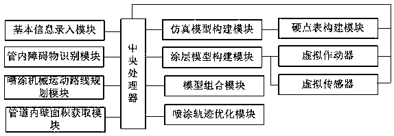 摘要:本发明公开了一种管道内喷涂轨迹优化系统,包括基本信息录入模块,用于录入目标管道的带尺寸标注的设计图纸以及涂层要求、喷涂机械在不同档位下在该目标管道内工作时对应的喷涂覆盖面积以及喷涂覆盖厚度;管道内障碍物识别模块,用于实现管道内障碍物所在位置以及障碍物尺寸数据的获取;喷涂机械运动路线规划模块,基于所得的障碍物所在位置和障碍物尺寸数据,规划喷涂机械运动路线;管道内壁面积获取模块,用于根据录入的设计图纸以障碍物为基准将管道分割成若干个模块,并实现每个模块内壁面积的计算;喷涂轨迹优化模块,以综合成本最小为目标进行喷涂机械喷涂轨迹的优化。本发明实现了喷涂轨迹的优化,从而保证了涂层的性能。