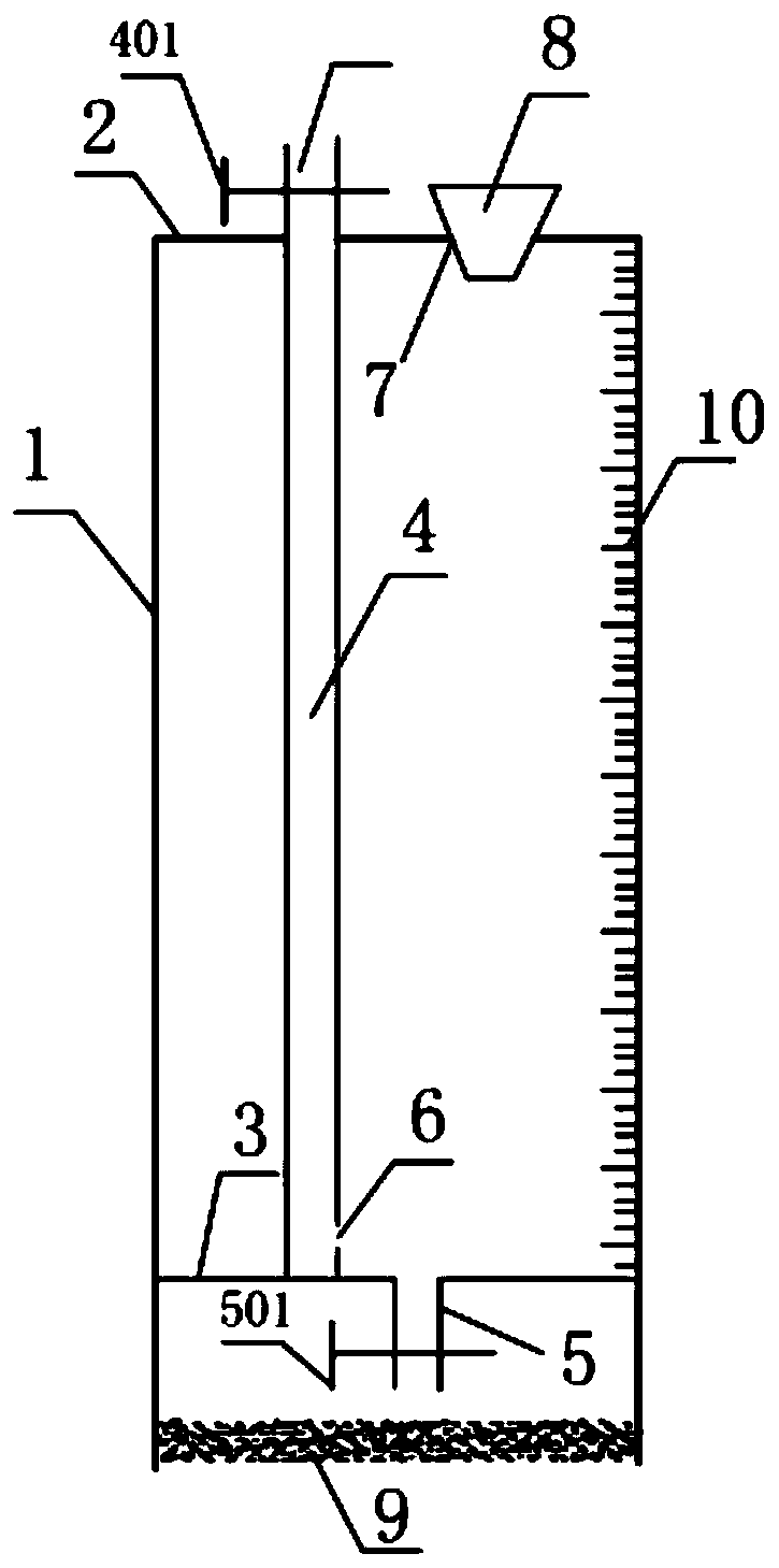 摘要:本发明公开了一种测量原状土饱和导水率的圆筒入渗仪及其测量方法,圆筒入渗仪包括圆筒、顶板、隔板、排气管和出水管,顶板密封安装在圆筒的一端顶部,隔板密封安装在圆筒的另一端上部,排气管的一端穿设于顶板,排气管的另一端与隔板连接,排气管上开设有通气孔,出水管贯穿安装于隔板上,排气管的管口安装有排气阀,出水管的管口安装有止水阀,顶板上设有进水口和橡胶塞,圆筒的底端安装有透水垫,圆筒的侧壁设有刻度尺,该入渗仪结构简单,能快捷、准确地测定原状土饱和导水率,以解决现有测定导水率装置操作繁琐及准确率不高的问题,该测量方法的计算结果不受过多因素的干扰,避免了多种数据掺杂导致导水率Ks的计算结果精度偏差过大的现象。
