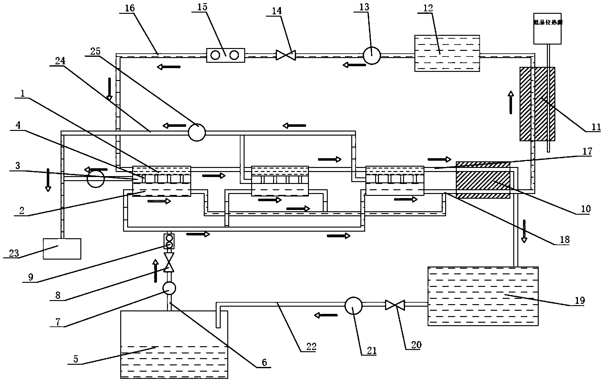 摘要:本实用新型公开了一种带有能量回收利用的多级膜蒸馏系统,包括至少一个膜蒸馏组件,膜蒸馏组件包括热料腔室和冷料腔室,热料腔室和冷料腔室之间设置有膜体,膜体下端间隙设置有冷壁,膜体与冷壁之间形成有气隙室,气隙室内间隔设置有若干冷凝件,热料腔室两端分别设置有热料进水口和热料出水口,冷料腔室两端分别设置有冷料进水口和冷料出水口,气隙室一端设置有冷凝水出液口,热料腔室上端连通有热料组件,所述冷料腔室下端连通有冷料组件。本实用新型可以对低品位热源的热量回收利用,相比于反渗透等系统最大的特点是热膜耦合后,此系统上的耗能少、压力小可以充分利用低品位热源,并实现了对水蒸气相变热的回收利用及热料液余热的循环利用。