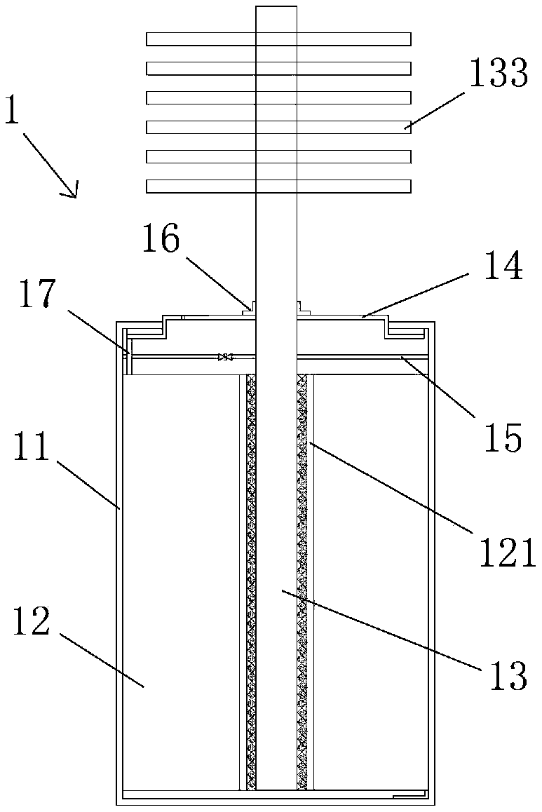 摘要:本实用新型属于电池技术领域。为了解决由于圆柱形锂离子电池的内部热量无法快速散出,而影响电池使用性能和使用寿命的问题,本实用新型公开了一种基于热管冷却的圆柱形锂电池单体。该圆柱形锂电池单体包括壳体、电极材料层和热管;其中,所述电极材料层以空心卷形结构固定在所述壳体内部,并且在其中心位置设有空心卷轴;所述热管的蒸发段位于所述空心卷轴内,所述热管的冷凝段伸出至所述壳体外部。本实用新型的圆柱形锂电池单体,可以实现将位于电池单体内部的热量直接快速引出散热,完成对电池单体的快速冷却降温,从而避免电池单体内部设备长时间处于高温状态而导致使用性能和使用寿命的降低。