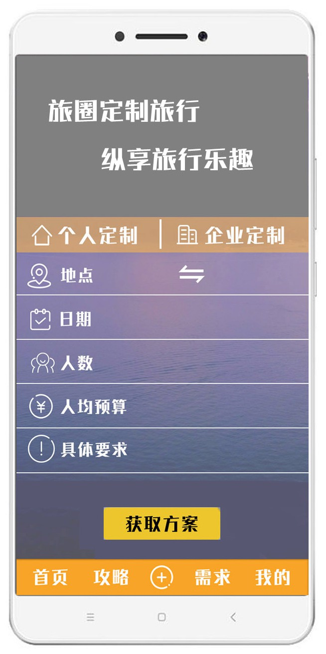 摘要:1.本外观设计产品的名称:用于手机的图形用户界面(旅圈app)。2.本外观设计产品的用途:用于运行程序以及进行交互操作。3.本外观设计产品的设计要点:在于屏幕中的图形用户界面内容。4.最能表明设计要点的图片或照片:变化状态图1。5.由于手机为现有设计,省略后视图、左视图、右视图、俯视图、仰视图。6.图形用户界面的用途:本界面用于定制旅游、发表旅游攻略、查找旅游路线等;主视图中的图标可放置于手机界面中的任意位置;点击主视图中的图标可进入相应的应用程序,具体地:1)点击主视图中的图标进入变化状态图1,用户点击横线处选项填入旅游需求后再点击“获取方案”,即可看到定制旅游方案相关信息,界面底部设有操作选项,包括:“首页”、“攻略”、“+”、“需求”和“我的”;2)点击变化状态图1 中的“攻略”选项进入变化状态图2,显示其他用户已发表的旅游攻略等信息;3)点击变化状态图1 中的“+”选项进入变化状态图3,显示发表旅游攻略的操作选项,包括“写攻略”、“写游记”、“拍摄”和“直播”