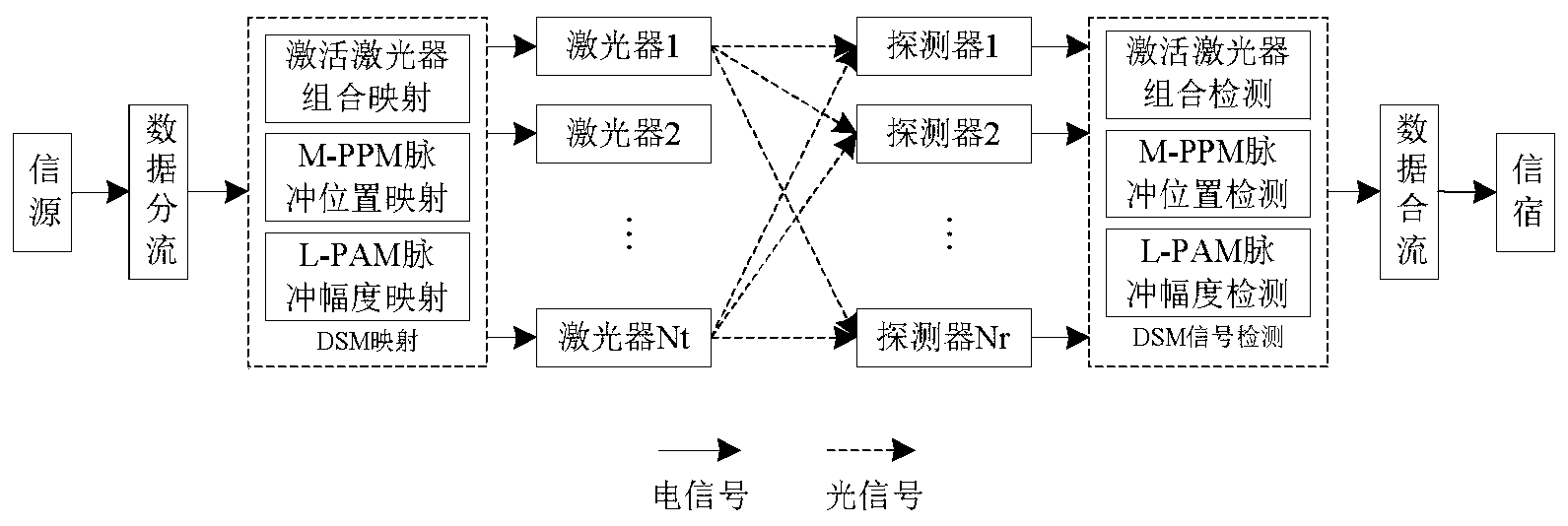 摘要:一种无线光通信的双空间调制方法,其目的是利用PPM调制和PAM调制建立一种无线光通信的双空间调制方法,从而提高无线光通信系统的传输速率。该方法主要通过每次同时激活两个激光器来分别发送脉冲位置调制(PPM)和脉冲幅度调制(PAM),进而提高系统传输速率。首先,发射端利用激光器映射向量、M‑PPM调制符号和L‑PAM调制符号的特点构建了发射信号矩阵,然后发送的光信号经湍流信道后到达接收端由光探测器接收。假设接收端已知信道状态信息,即在H已知的情况下,采用最大似然译码算法进行信号检测,恢复出原始比特信息。在此基础上利用联合界技术推导了该方法在对数正态信道下的理论误码率上界。