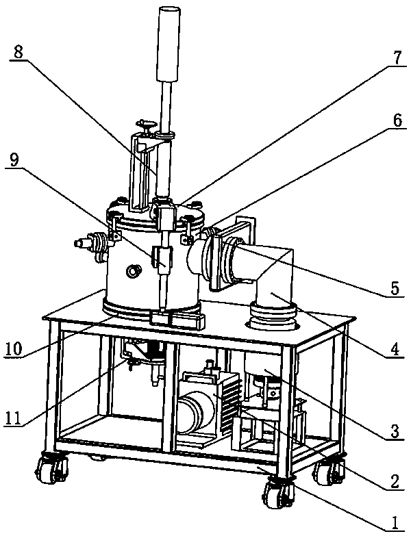摘要:一种超声热电复合场作用下的润湿性测试装置,包括支架1、机械泵2、分子泵3、真空管道4、阀门5、真空炉体组件6、上端盖7、超声波组件8、端盖提升组件9、下端盖10、样品台组件11。超声波发生器8a通过波纹管组件1与上端盖7连接保持真空腔室的真空度,由升降平台1带动上下移动与样品接触或者分离。弱电馈入电极6e通过球铰链安装在炉体外壳6g的法兰上,与放置在可移动的放料平台11a上的样品片共同构成弱电测试的两极。图像采集和处理部分采用CCD数码相机或高速摄像机与光源分别放置在炉体前后并且和炉体的石英玻璃观察窗,屏蔽层上的通孔和加热通孔的对称轴线处于同一水平上。