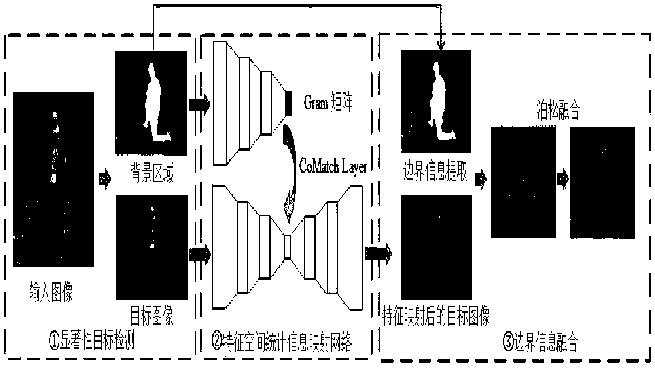 摘要:本发明提出了基于特征空间统计信息映射的目标自适应隐藏方法,使用深度卷积的学习方式,在使用显著性目标检测进行目标与背景区域划分的基础上,分别获取目标特征空间与表征背景风格特征的特征空间统计信息,建立目标图像与背景区域图像间关于特征空间统计信息的映射网络,使得目标图像具有背景区域图像的特征空间统计信息,并通过边界融合获得目标自适应隐藏的图像。本发明提出了建立目标图像与背景区域图像间关于特征空间统计信息的映射网络,进行目标自适应隐藏的任务目标,并针对任务目标提出了相应的解决方案,获得了良好的结果,具有重要的理论意义和实践价值。