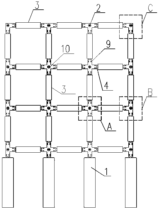 摘要:本实用新型涉及一种节点连接部件以及框架预应力锚索支护结构,该节点连接部件包括上部板(5)、下部板(6)以及设在两者之间的侧面板(7),上部板与下部板在需要连接待拼接对象的方向均具有供预留主筋(4)穿过的钢筋孔(9),中心位置具有供预应力锚索(2)穿过的竖向锚索孔(10)。待拼接对象包括预制梁(3)、预制桩基(1),其在需要连接的端部具有预留主筋。本实用新型节点连接部件结构简单,装配方便快捷,不仅省工省时,节约成本,还有效提高了工程质量。同时,对于使用该种节点连接部件的支护结构,实现了预制梁、预制桩基和节点连接部件的标准件预制,简化了施工步骤,且不受天气影响,极大的降低了施工难度。