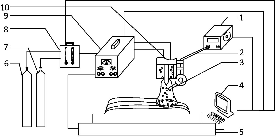 摘要:本实用新型公开一种碳元素原位强化的梯度钛合金TIG电弧增材制造装置,TIG焊机在工作过程中产生电弧,钛合金焊丝和周围钛合金材料在TIG电弧热量作用下呈熔融态;将氩气与二氧化碳用配比器混合配比后输出,混合气体中二氧化碳在电弧作用与熔融态的钛合金原位反应,在待加工钛合金材料上原位生成碳化钛增强相,分布于成形钛合金材料中。调节气体配比器实现不同的二氧化碳氩气配比,从而得到不同的梯度强化效果。本实用新型在钛合金增材制造的过程中,同时实现对钛合金材料的强化,无需二次强化,减少工艺流程,同时可以通过调节不同的气体配比实现钛合金材料的可控梯度强化,扩大了钛合金材料的使用范围。