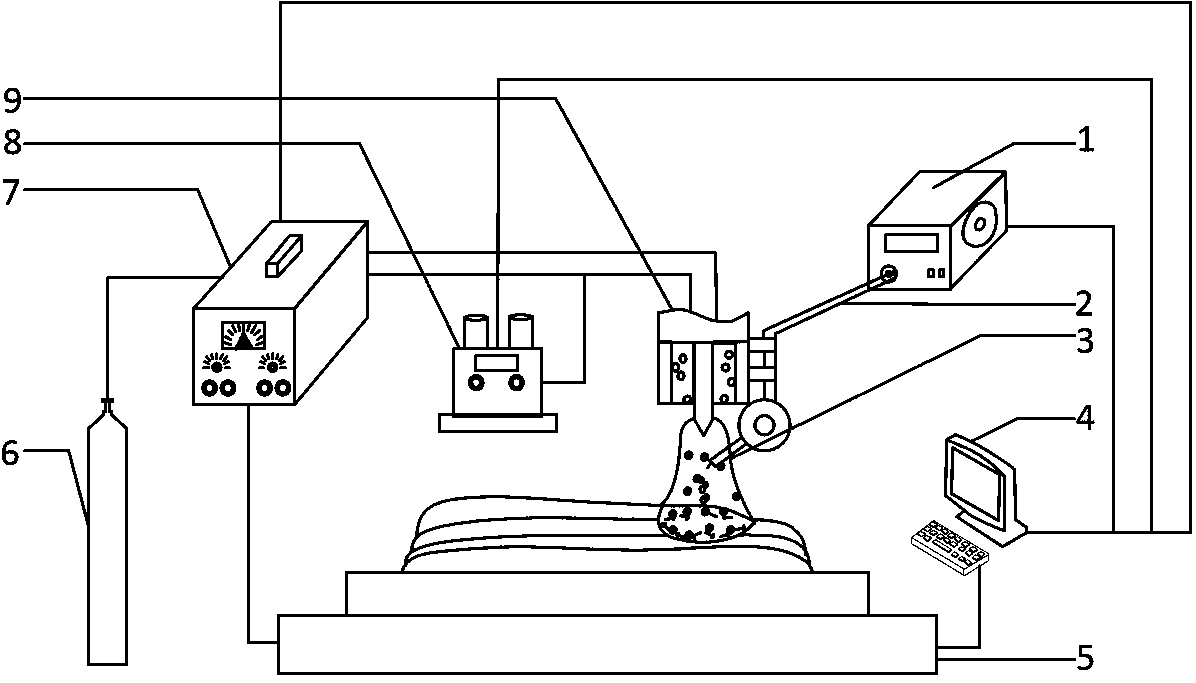 摘要:本实用新型公开一种硼元素原位强化的梯度钛合金TIG电弧增材制造装置,TIG焊机在工作过程中产生电弧,钛合金焊丝和周围钛合金材料在TIG电弧热量作用下呈熔融态;硼在TIG电弧作用下与熔融态的钛合金原位反应,在待加工钛合金材料上原位生成硼化钛增强相,分布于成形的钛合金材料中。调节送粉装置实现不同的硼粉送入量,控制生成硼化钛增强相的比例,从而得到不同的梯度强化效果。本实用新型在钛合金增材制造的过程中,同时实现对钛合金材料的强化,无需二次强化,减少工艺流程,同时可以通过调节不同的硼粉送入量实现钛合金材料的可控梯度强化,扩大了钛合金材料的使用范围。